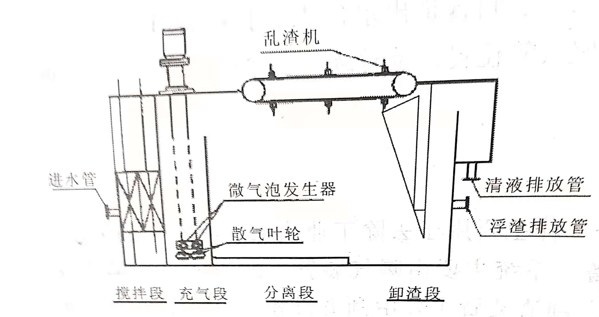 旋切式氣浮屬于引氣擴散氣浮,它與溶氣氣浮、噴射引氣氣浮、多級擴散氣浮及電解氣浮機理相同,因而同樣具有廣泛的應用前景。其最大的優點是形成的氣泡直徑與溶氣氣泡直徑相近,但其能耗卻小得多,而且不需要空壓機、溶氣罐、減壓釋放器等設施,占地面積小,基建投資也不大。旋切式氣浮機如下圖所示。